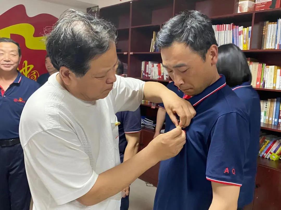 隨后,黨支部書記付彩廷為預(yù)備黨員佩戴黨徽;